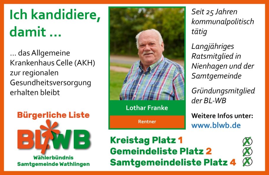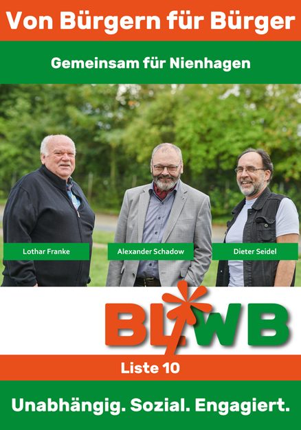 Dafür arbeiten die Mitglieder der UWG/BL-WB - Gruppe parteipolitisch ungebunden im Gemeinderat Nienhagen und den Ausschüssen ehrenamtlich, sachorientiert mit.